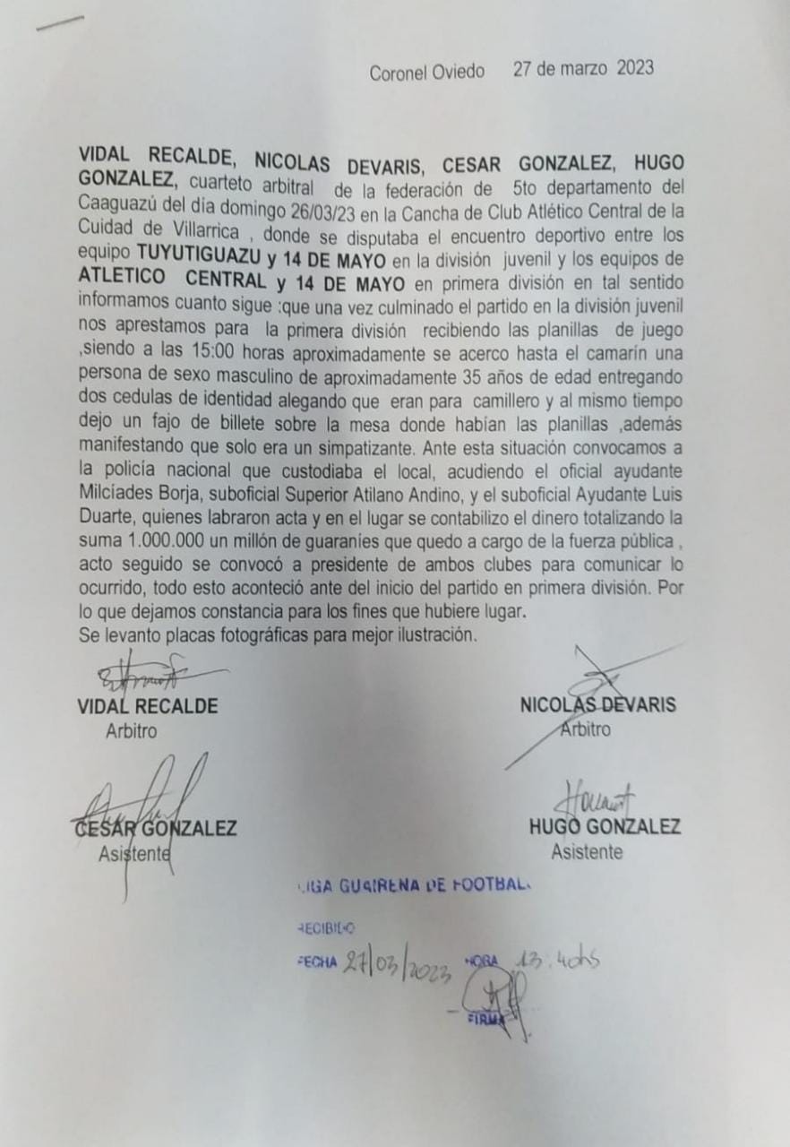 El cuarteto arbitral integrado por Vidal Recalde, Nicolás Devaris, Cesar Gonzáles y Hugo González denunció un supuesto soborno previo al encuentro deportivo de este fin de semana entre los equipos de Atlético Central y 14 de Mayo por la semifinal (vuelta) de la Liga Guaireña de Fútbol.