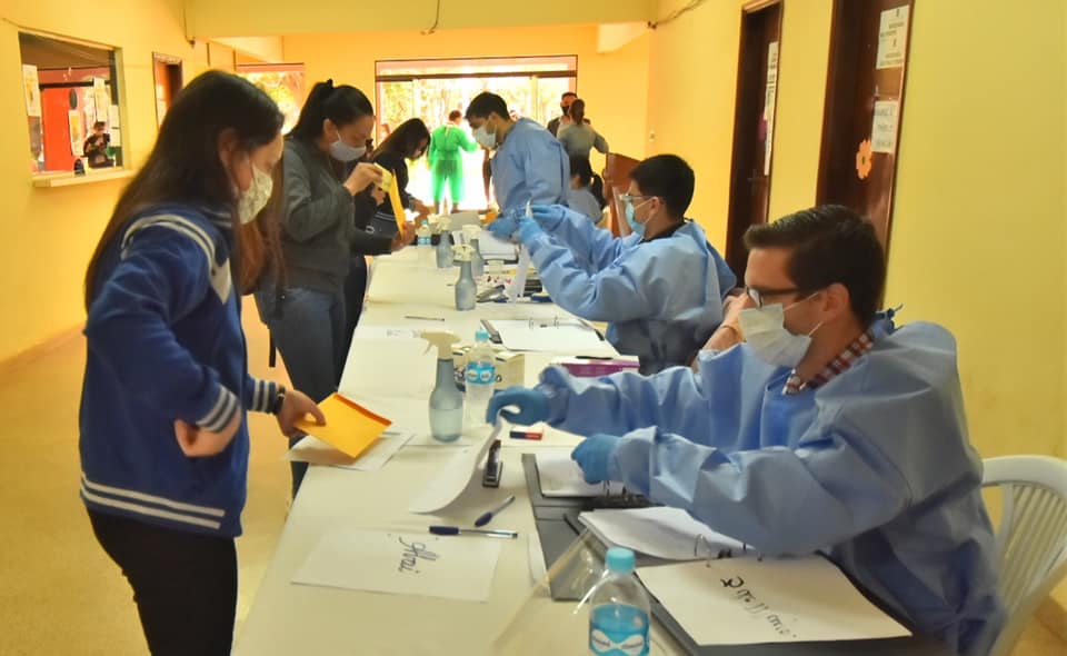 Bajo estrictas medidas sanitarias, cumpliendo con todos los protocolos establecidos por el Ministerio de Salud Pública y Bienestar Social, los estudiantes van acercándose a las mesas dispuestas en el local de la Gobernación, para recibir los cheques correspondientes.
