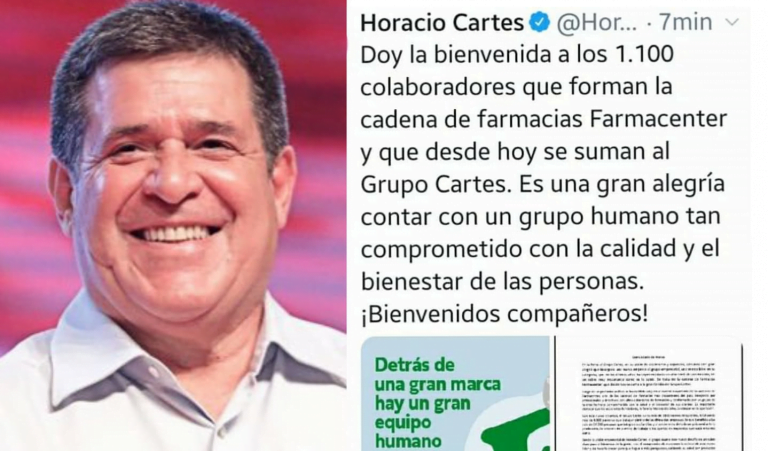 Horacio Cartes informó en su cuenta de Twitter que la cadena de farmacias Farmacenter se incorporó al Grupo Cartes.