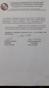 El movimiento Campesino Paraguayo M.C.P 3 de Octubre con base en Repatriación a través de una nota dirigida al Presidente del INDI Dr. Edgar Olmedo pidieron que la institución investigue la venta del inmueble perteneciente a indígenas Mbya guaraní en la zona Kurupi Kapii en Repatriación cerca de las compañías Pindoí y Timbo un asentamiento indígena de aproximadamente 1.200 hectáreas hace 20 años ,.