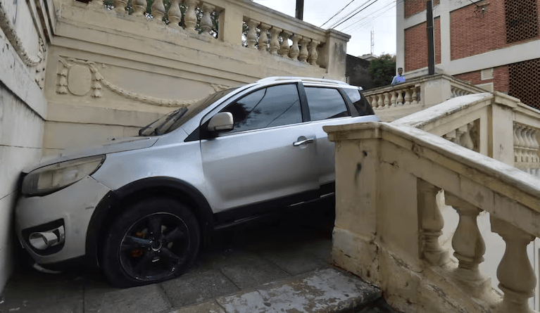 Según el reporte policial, el conductor del rodado protagonizó un choque contra otro, decidió escapar, fue perseguido por la víctima, cayó por la escalinata y quedó atrapado en esta zona del microcentro de Asunción. Posteriormente, se dio a la fuga a pie, dejando su automóvil en el lugar.