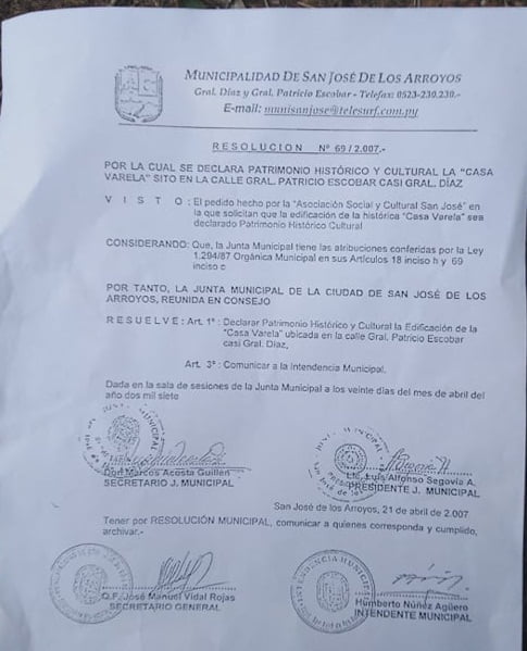 La declaración oficial de Patrimonio Histórico Cultural de San José de los Arroyos, es  en base a la solicitud presentada por la Asociación Social y Cultural San José a la Junta Municipal de ese año 2007. Su aprobación, según Resolución No. 69/2007, emanada de la Junta Municipal, la cual declara Patrimonio Histórico Cultural “La Casa Varela”, sito en la Calle Gral. Patricio Escobar C/ Gral. Diaz.