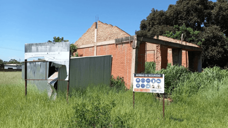 En la Escuela Básica N° 1302 Braulio Mendoza Areco (Maffusi) se observa una construcción abandonada desde el 2018. Hasta los carteles informativos de la licitación ya están deteriorados y los ladrillos que alguna vez fueron instalados ya empiezan a caer en pedazos.