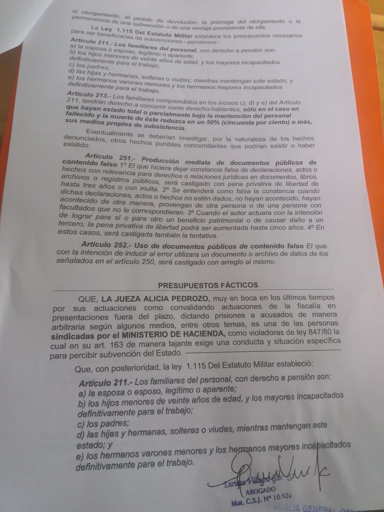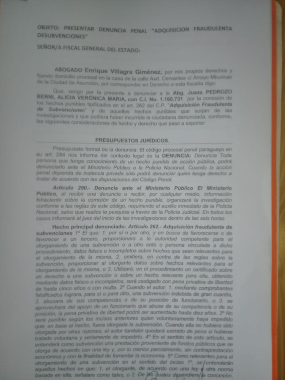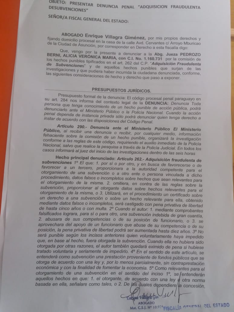 La jueza Alicia Pedrozo Berni fue denunciada por el Abog. Enrique Villagra por «adquisición fraudulenta de subvenciones» ante la Fiscalía General del Estado.