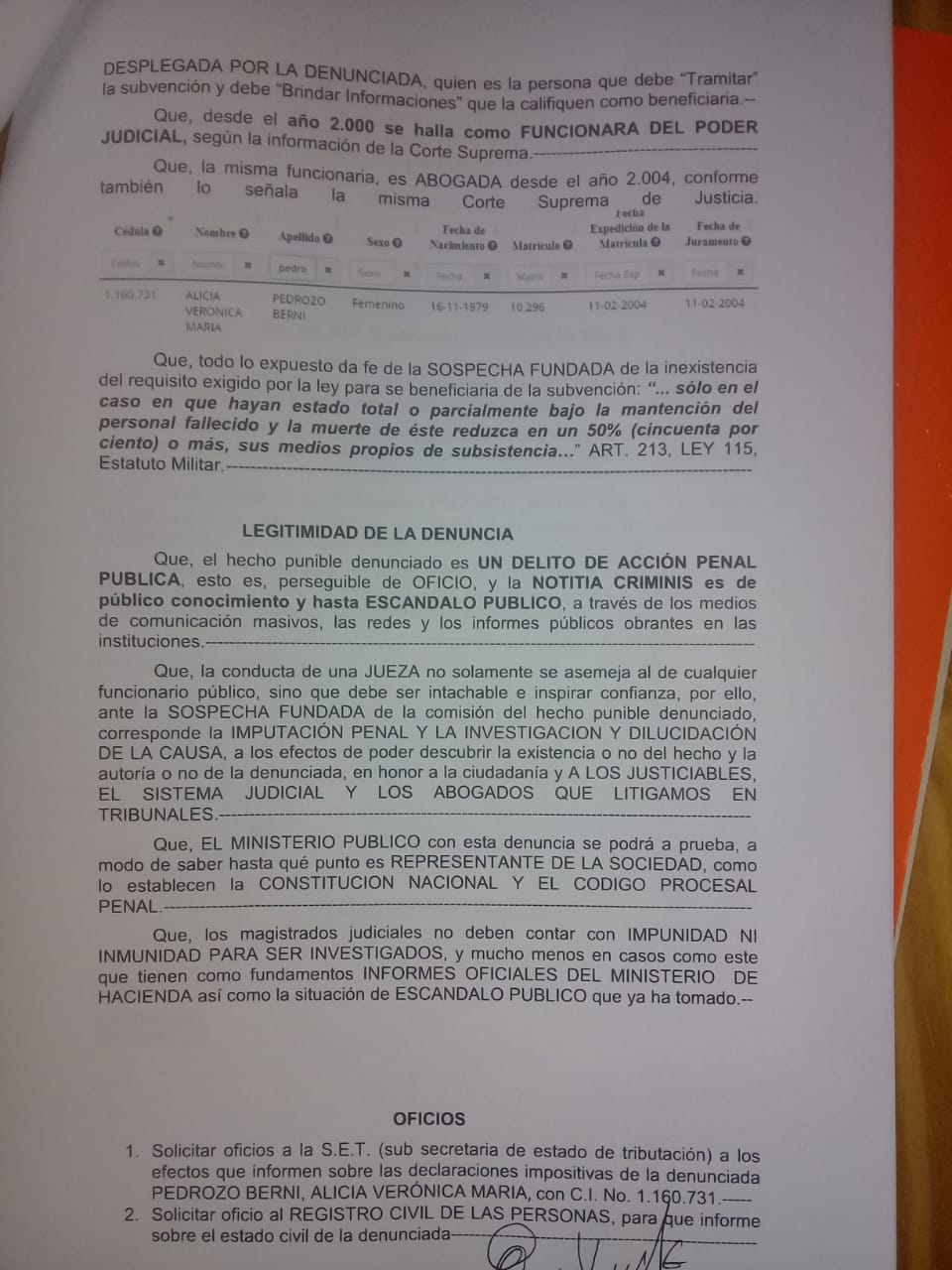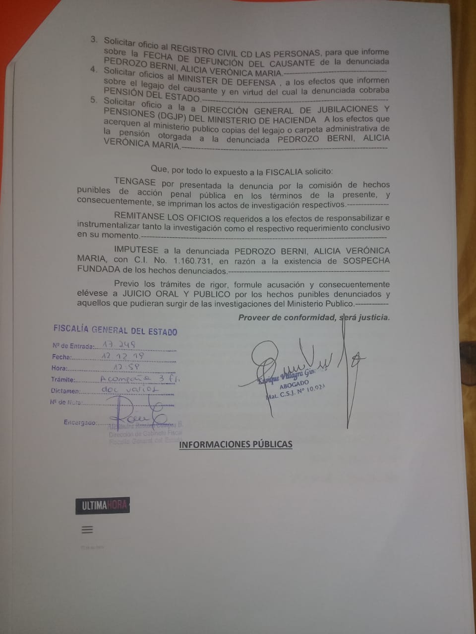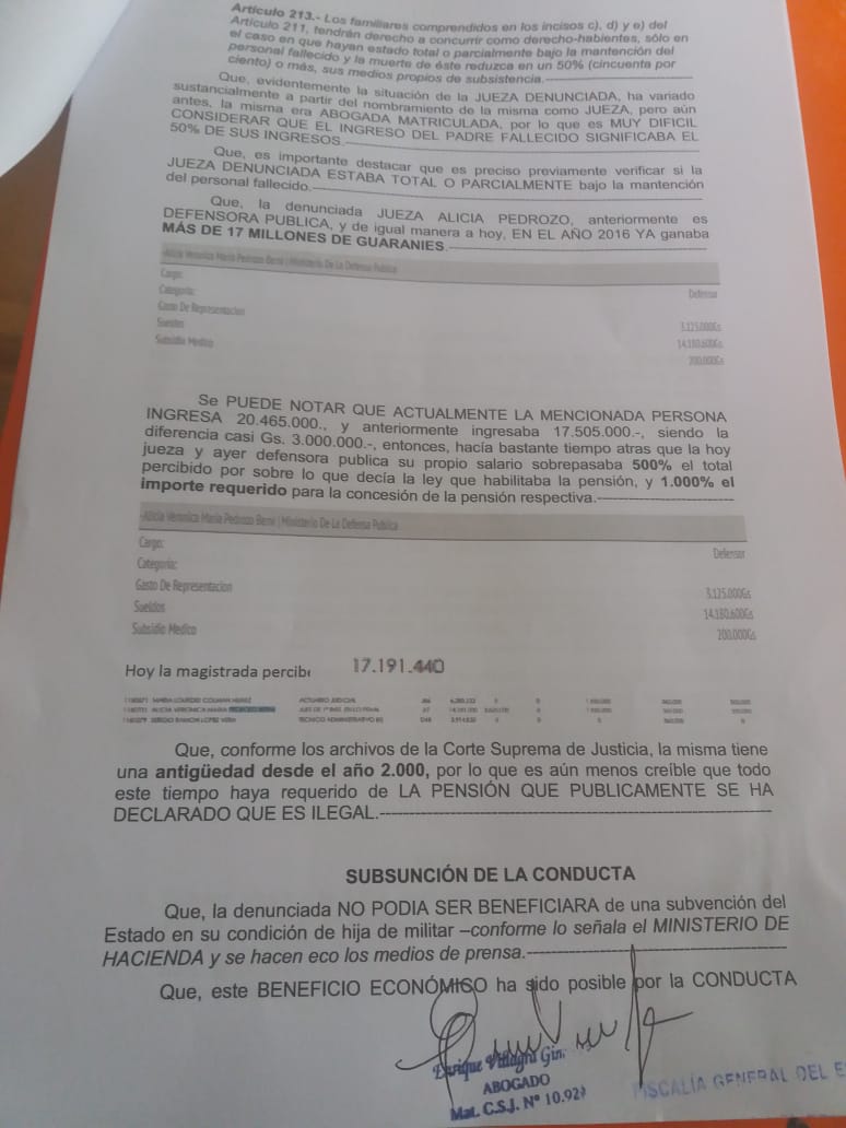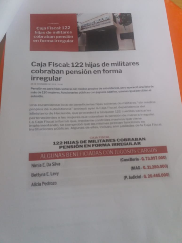 La misma aparentemente según la denuncia cobraba una pensión como hija soltera de militar sin medios propios de subsistencia pese a que tiene un jugoso sueldo de más de Gs. 20.000.000.