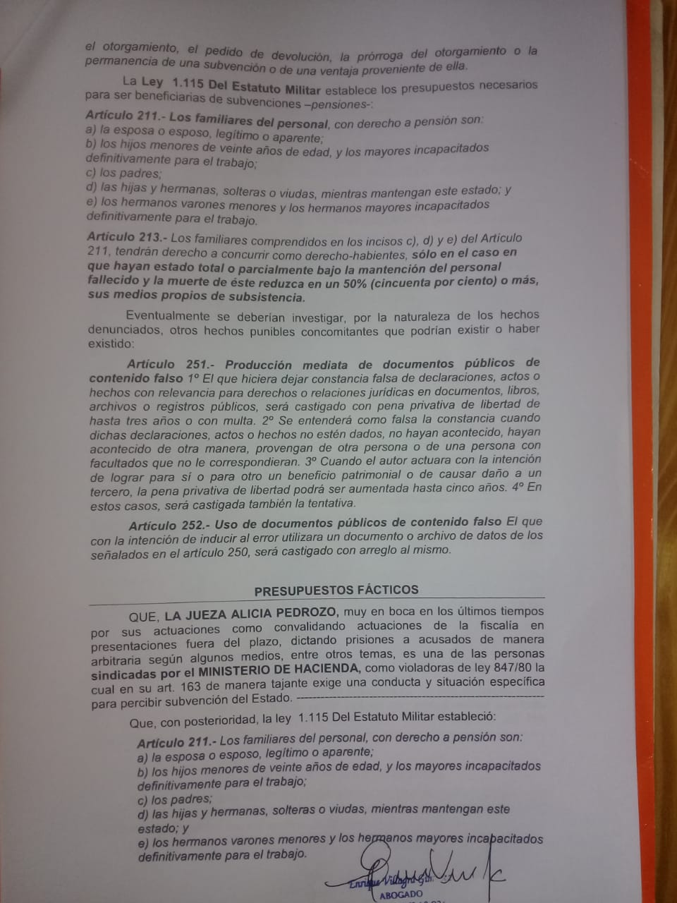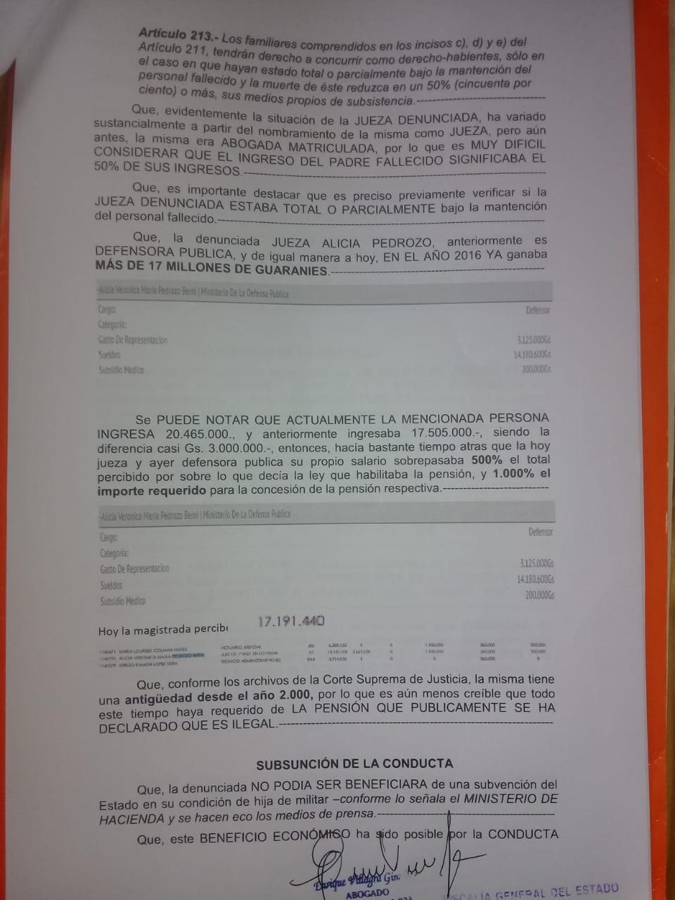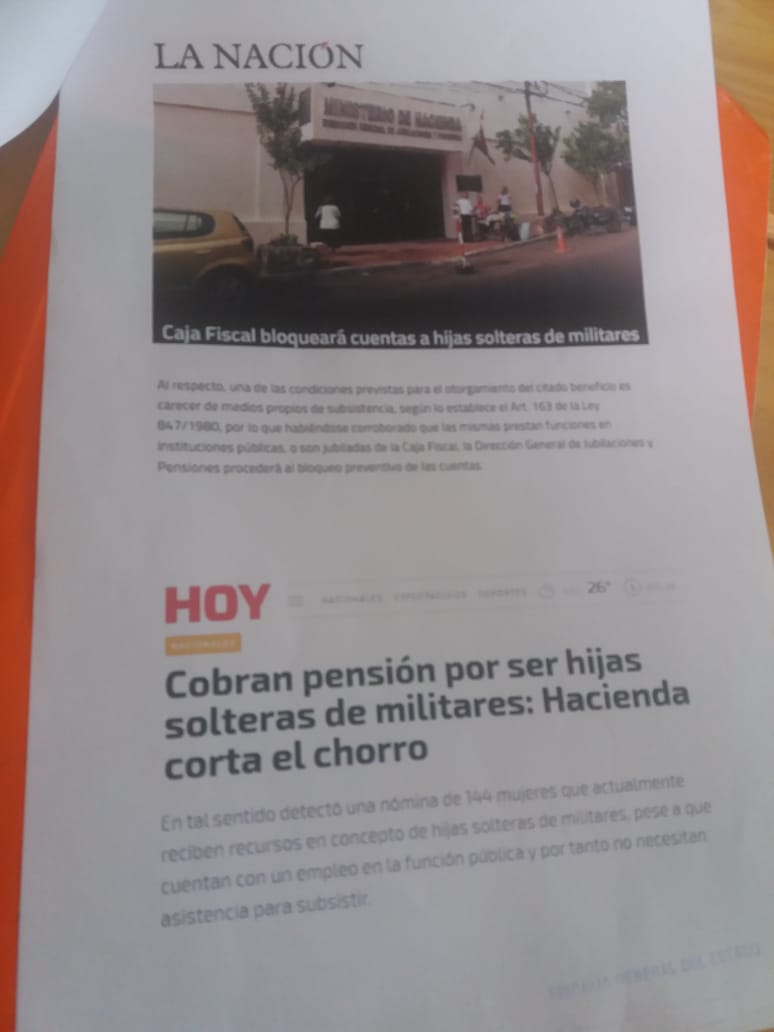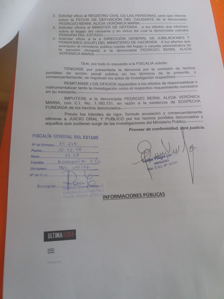 La misma aparentemente según la denuncia cobraba una pensión como hija soltera de militar sin medios propios de subsistencia pese a que tiene un jugoso sueldo de más de Gs. 20.000.000.