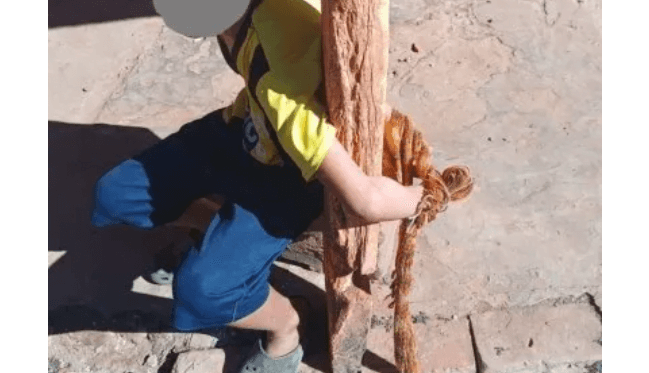 ¡Nde bárbaro! Un niño de 9 años fue atado de manos por un poste de madera por su bisabuela de 79 años.