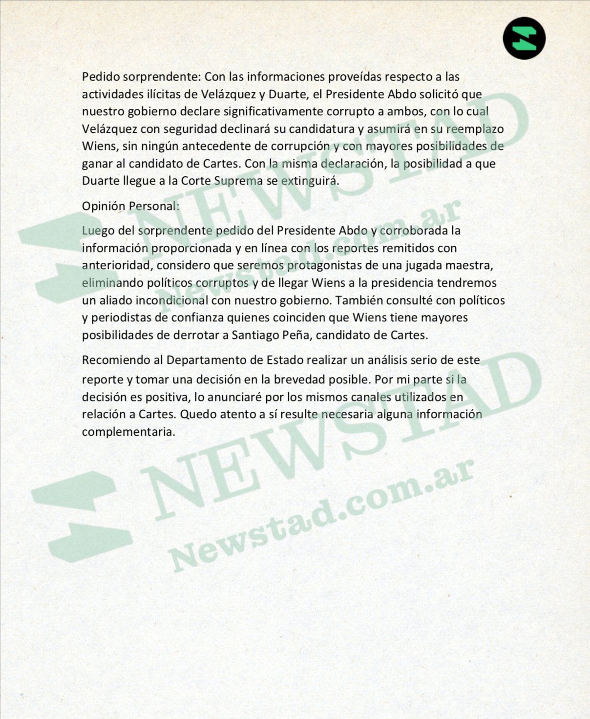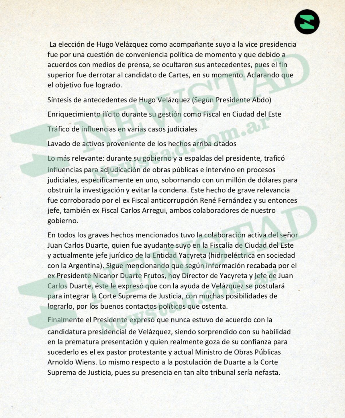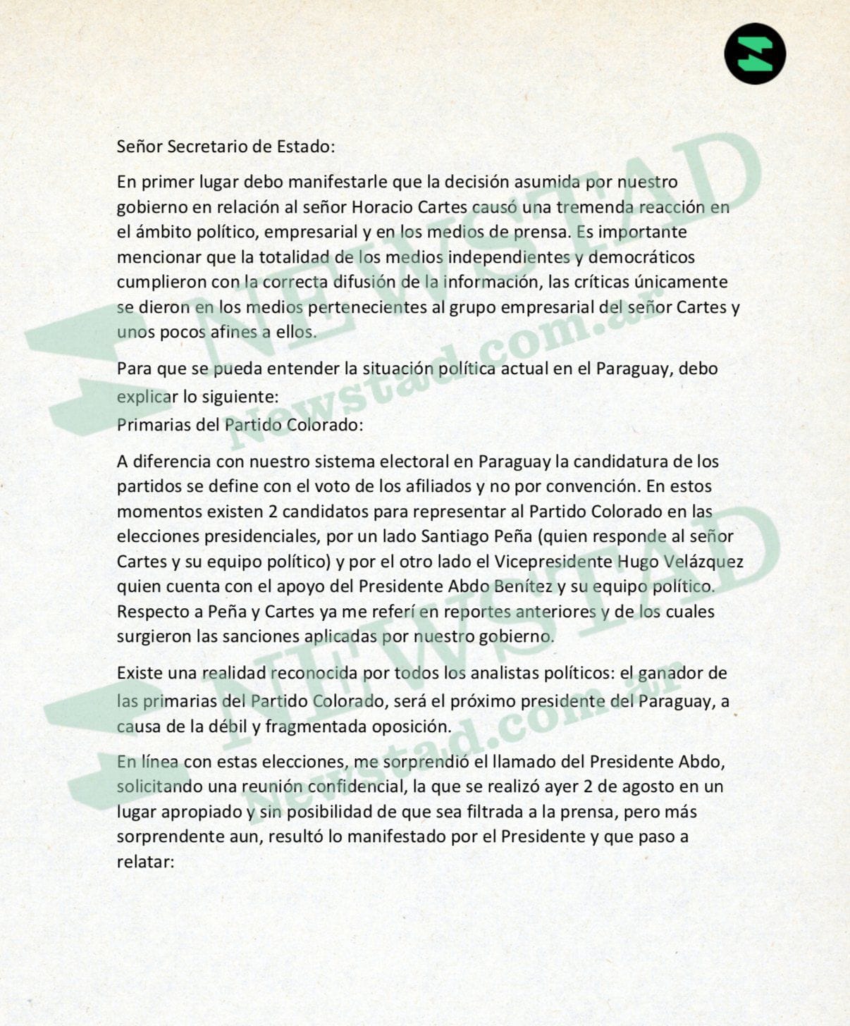 El documento detalla una reunión entre Ostfield y el entonces presidente Mario Abdo Benítez, en la que este último expresó su rechazo a Santiago Peña (candidato respaldado por Horacio Cartes) y su preferencia por Arnoldo Wiens, exministro y expastor, como candidato colorado. Abdo acusó a su entonces aliado Hugo Velázquez (vicepresidente y aspirante presidencial) de corrupción grave —incluyendo tráfico de influencias, lavado de activos y adjudicaciones irregulares— y pidió explícitamente a EE.UU. que lo sancionara como “corrupto significativo”, con el objetivo de eliminarlo de la contienda electoral y favorecer a Wiens.