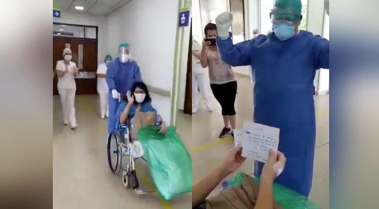 En un video que circula en redes sociales se ve a la personal de blanco que sale del área de internación en la compañía de un médico. La misma fue despedida en medio de aplausos por parte de todos sus compañeros y compañeras del área urgencias adultos donde se desempeñaba como enfermera.