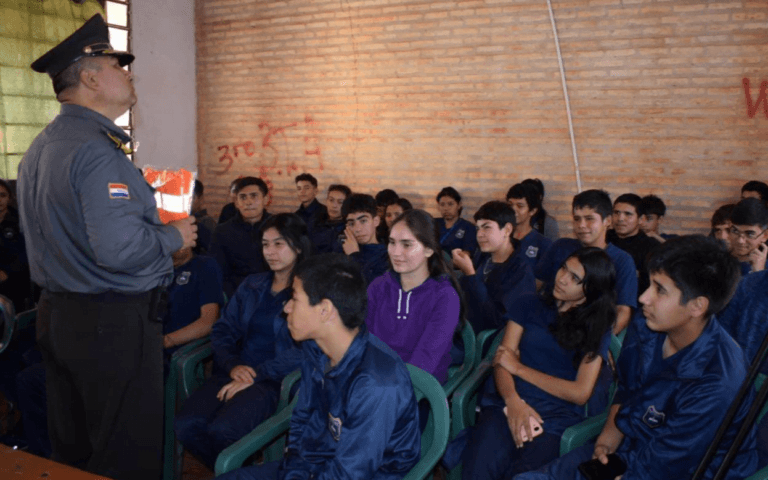 Cñia. Ka’aguy Kupe . – Con el objetivo de reducir los accidentes de tránsito, estudiantes del Colegio Nacional Doña Lidia Alvarenga, de la compañía ka’aguy Kupe, que en los documentos figura estar en la jurisdicción del distrito de San José de los Arroyos, departamento de Caaguazú, participaron en forma masiva esta mañana de una charla de concienciación sobre seguridad vial, desarrollada por especialistas del área. El Ministerio de Obras Públicas y Comunicaciones (MOPC), viene desarrollando en los colegios secundarios ubicados en los tramos de la duplicación de la Ruta PY02, con el firme propósito de mermar los accidentes de tránsitos, que muchas veces ocurren por el desconocimiento de las leyes de tránsitos, indicaron los profesionales del área.