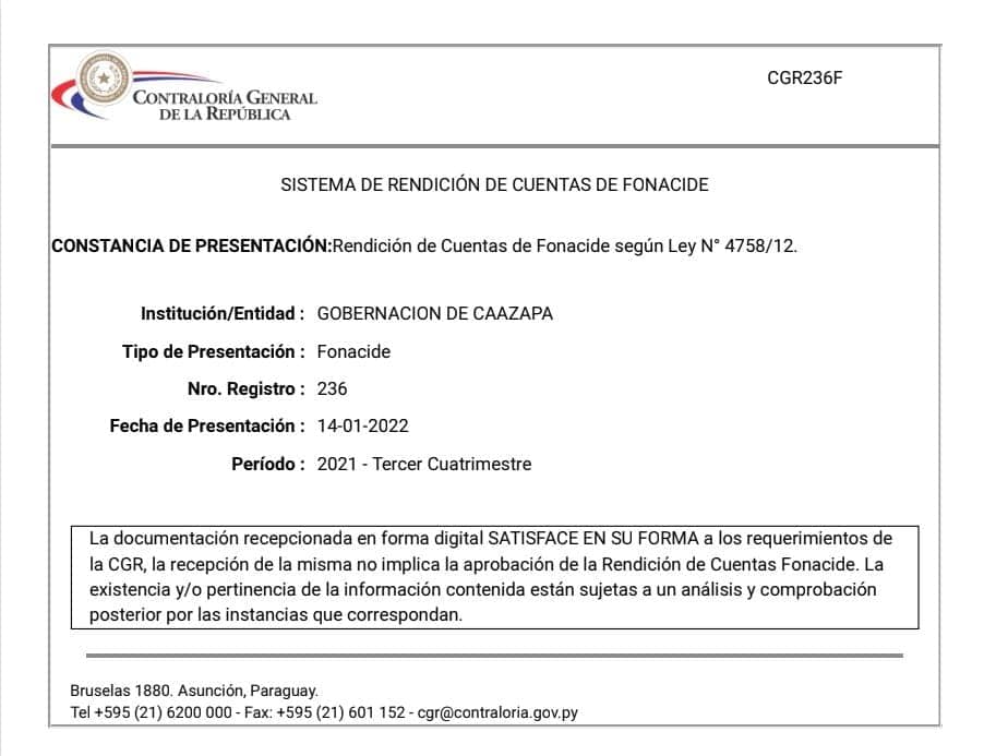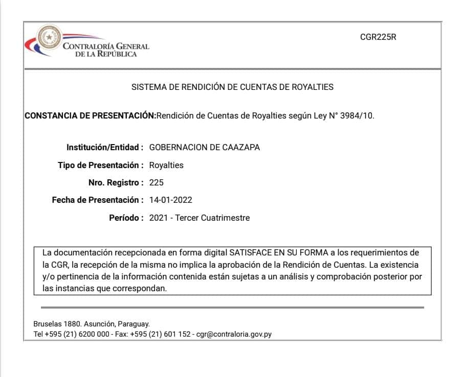 El Gobernador de Caazapá Abg. Pedro Alejandro Díaz Verón presentó en tiempo, forma y con transparencia ante la Contraloría General de la República la Rendición de Cuentas de los recursos correspondientes a ROYALTIES y FONACIDE, dando cumplimiento con las disposiciones legales vigente.