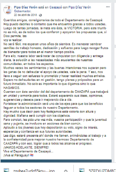 La administración del Abg. Pedro Alejandro Díaz Verón destaca entre entre las demás gobernaciones ya que en tan poco tiempo ha realizado varias obras viales, y ha invertido en infraestructura en escuelas quedando así este departamento como “modelo de desarrollo”.