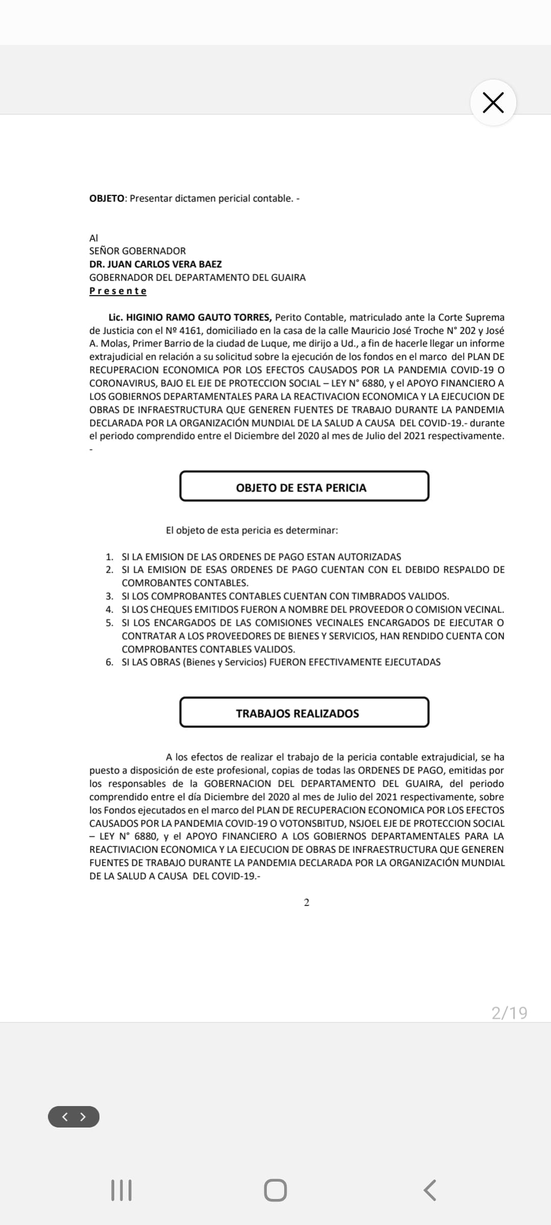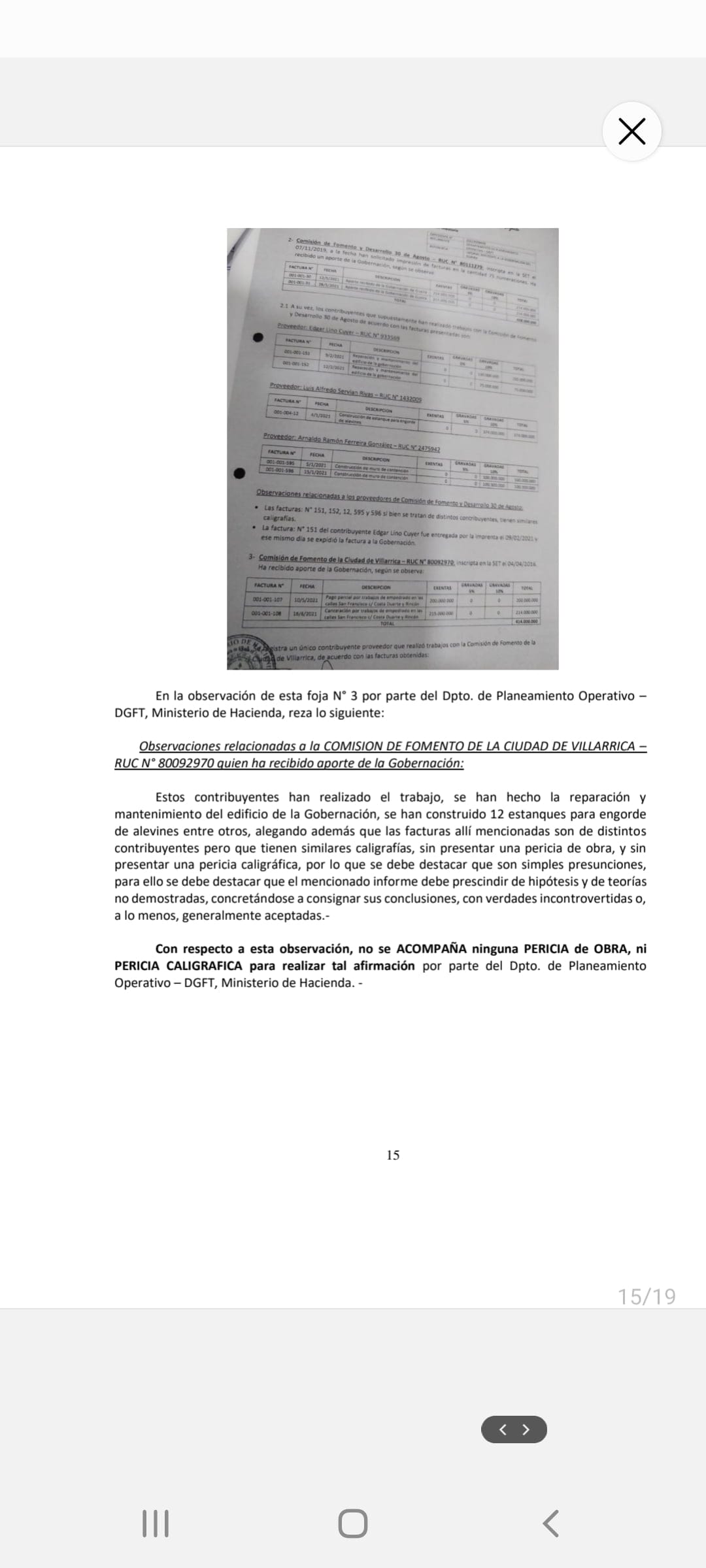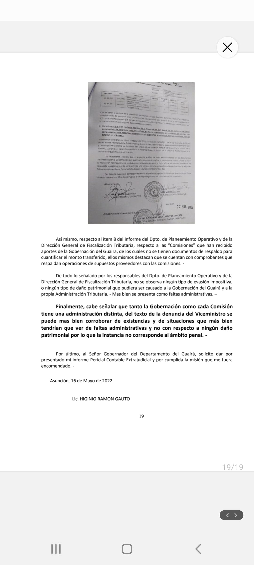 Explicó que un perito matriculado por el Ministerio de Justicia realizó una pericia contable de todos los puntos que fueron denunciados por el Ministro de Tributación y este determino que no hay daño patrimonial que todos los puntos objetados por el viceministro de tributación fueron solo faltas administrativas y que esto no constituye un delito .