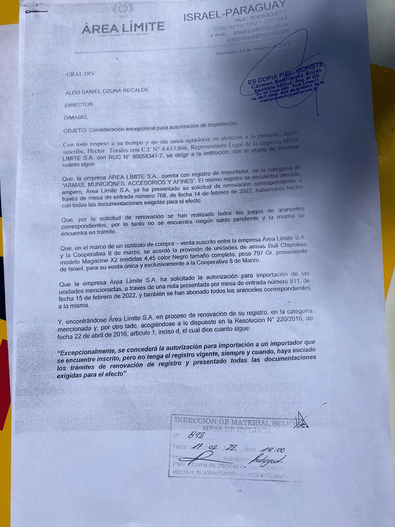 Sin embargo, Báez cuenta que antes de que la carga aterrice en Paraguay, el 14 de febrero, ya se había iniciado el trámite de solicitud para renovar la licencia de importación. Cuestión que sigue en proceso.