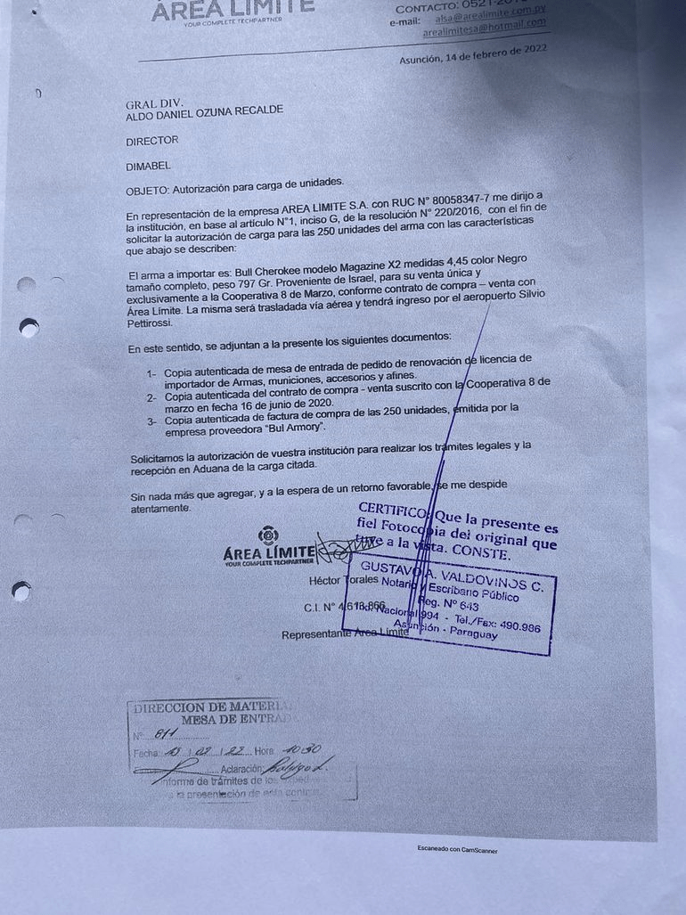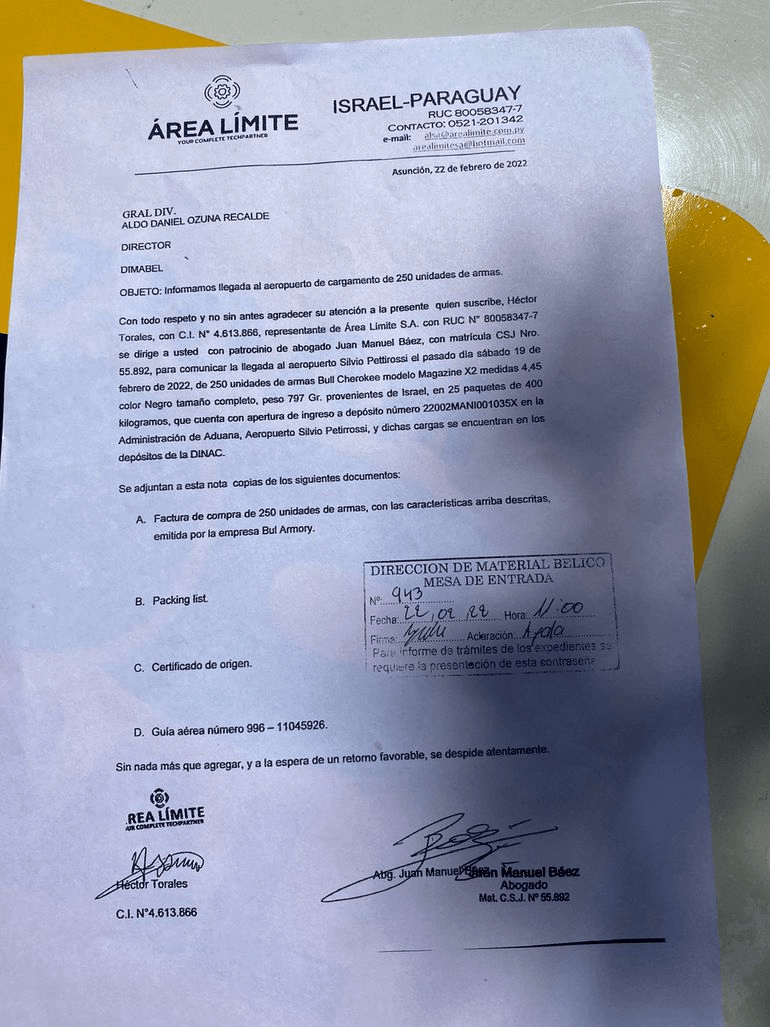 De manera a respaldar la veracidad y la legalidad de la importación, Báez explicó que informaron a Dimabel que la carga llegó el 19 de febrero. Manifestó que presentaron la lista de empaque, donde están los datos de serie de las armas, así como las facturas, el certificado de origen y la guía aérea.