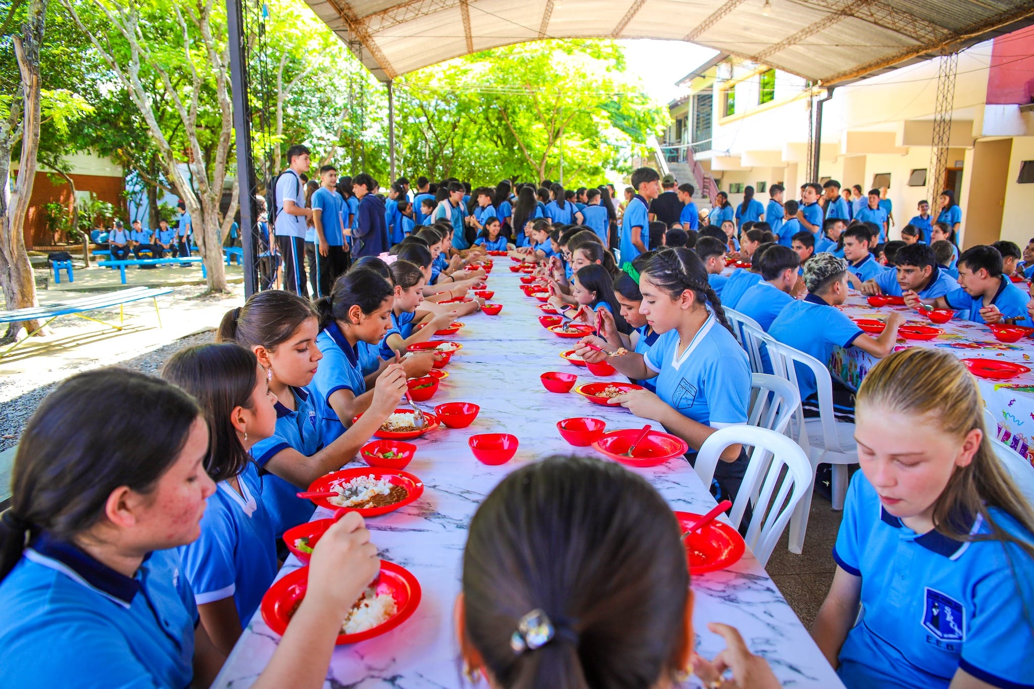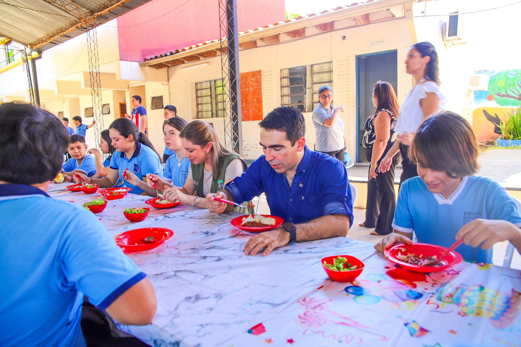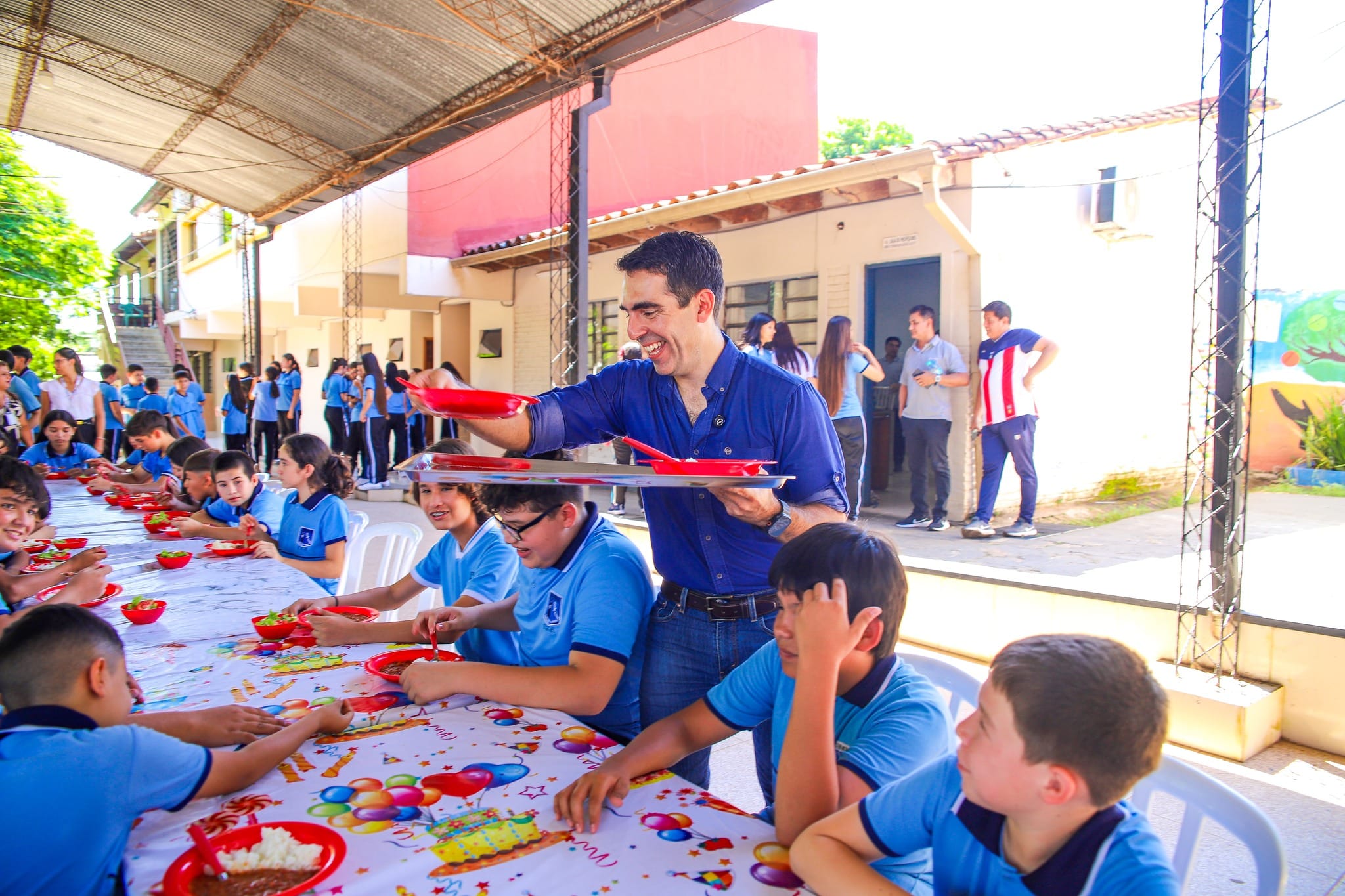 Ayer en el Colegio San Roque González de Santa Cruz de Coronel Oviedo, el Gobernador Marcelo Soto y la Primera Dama Departamental Laura Samudio compartieron un almuerzo con los alumnos.