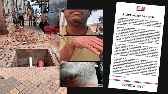 Sergio Palacios es un comunicador con discapacidad visual y trabajador de la Comisión Nacional de Telecomunicaciones (Conatel), que cayó a un pozo no señalizado, el pasado lunes, en una zona de obras para el cableado subterráneo sobre la calle Ayolas casi Presidente Franco, que la Administración Nacional de Electricidad (ANDE) lleva adelante, bajo un subcontrato con la empresa contratista Consorcio Arcopel.