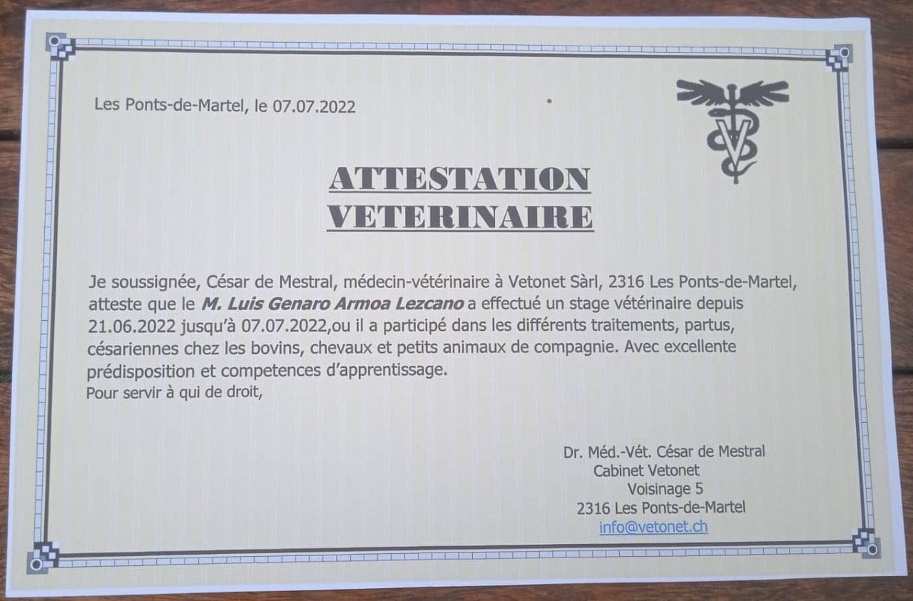 SAN JOSÉ DE LOS ARROYOS, Dpto. Caaguazú.-  Luis Genaro Armoa Lezcano; joven Médico Veterinario,  oriundo de esta comunidad, recientemente realizó un curso de especialización  en reproducción bovina en la ciudad  de Les Ponts – de  – Martel, Suiza.  Esto obedeciendo a la invitación cursada por un ex compañero de estudio del Instituto Agropecuario Carlos Pfannl;  El Dr. Médico Veterinario César de Mestral, profesional paraguayo descendiente  familia de suizo, radicado en ese país ya por cerca de una década.