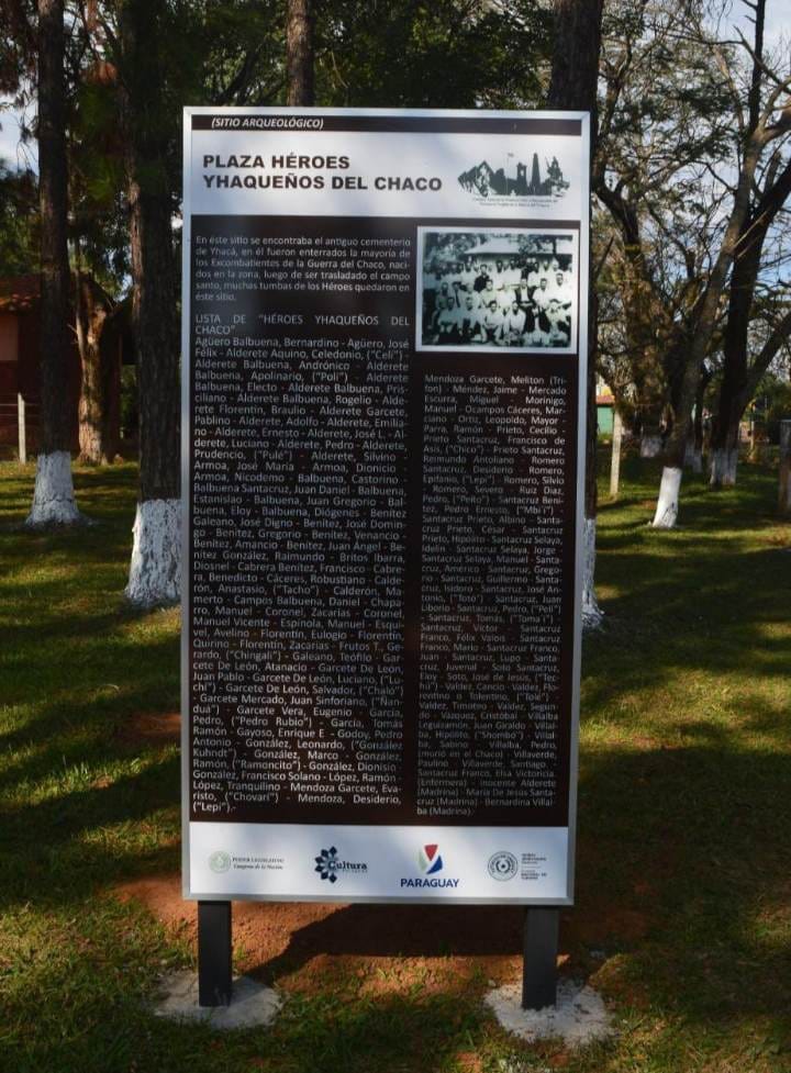 Antiguamente el lugar fue una especie de cementerio, lugar donde fueron enterrados unos 115 héroes del Chaco, oriundo de esta comunidad, de los cuales, sus familiares algunos los restos fueron llevados al actual camposanto, indicó Adalberto Alderete. Fue parte de esta capitalización del proyecto, el Senador Nacional del Frente Guasu, Pedro Arthuro Santacruz Insaurralde, de raíz yhaqueño, quien desde la instancia del Congreso Nacional gestión mediante, envió las respectivas placas y la construcción de una especie de monolito al soldado desconocido, ubicado en la parte central de la plaza.