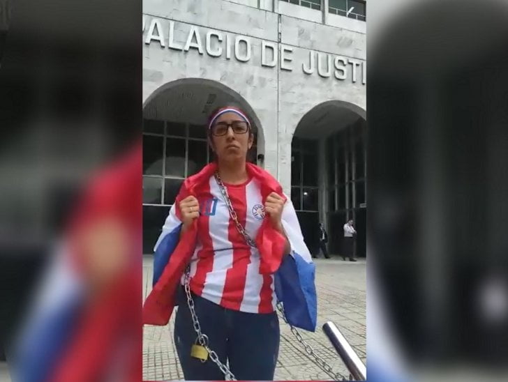 Encadenada frente al Palacio de Justicia, en Asunción, vestida con una remera de la albirroja, una cinta tricolor en la cabeza y una bandera de Paraguay, dijo que el niño manifestó que no se quiere ir del país. Asegura que se niega a ir con su padre, Sebastián Vieira, de quien la madre se separó por supuesta violencia doméstica.