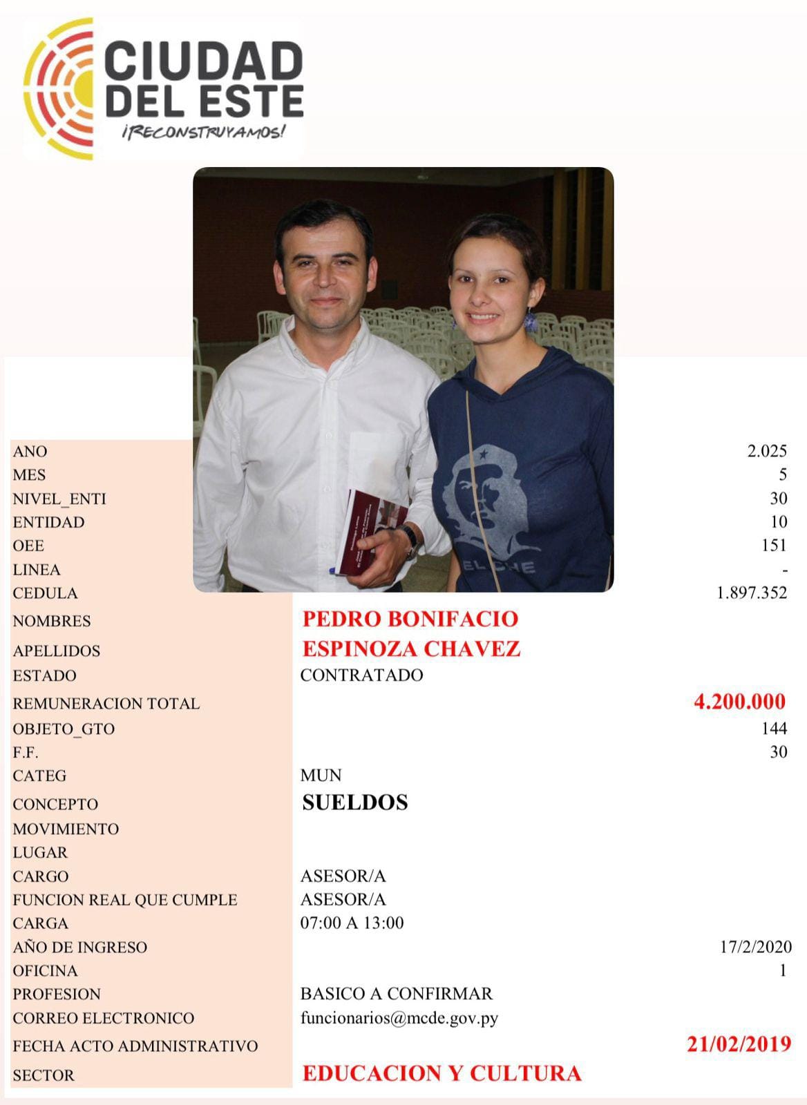 Pedro Bonifacio, actual funcionario de la Municipalidad de Ciudad del Este, es pareja de Doralice Meza, hermana de Magna Mesa, identificada por las autoridades como líder activa del grupo criminal EPP. Esta relación familiar ya había generado controversia en el pasado, pero el caso se agrava al recordar que en 2016, Espinosa y su pareja fueron objeto de un allanamiento donde se incautaron cargamentos de marihuana y panfletos alusivos al grupo armado.