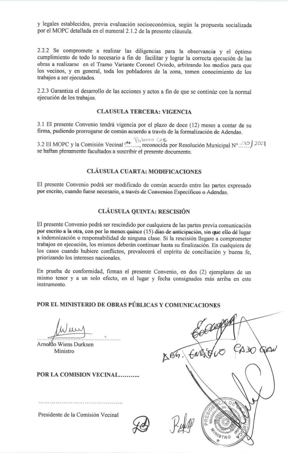 Luego de más de un año pobladores de Potrero Cue lograron tener la firma del Ministro de Obras Públicas y Comunicaciones Arnoldo Wiens para la construcción de un paso de nivel en la variante Ruta Py02.