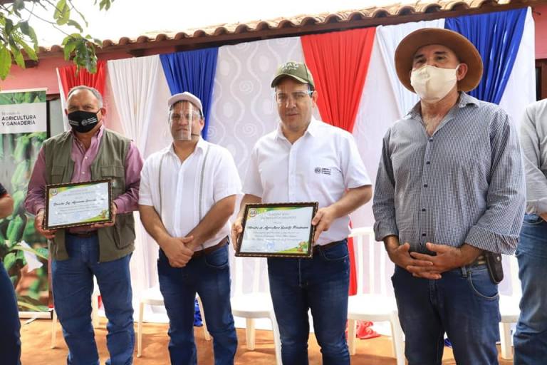 El Ministro de Agricultura y Ganadería Rodolfo Friedmann Alfaro y el titular de la Dirección de Extensión Agraria (DEAG) Ing. Gerardo Rojas, recibieron un reconocimiento a su gestión por parte de productores de la Compañía Juan Sinforiano Bogarin de Yhú, Departamento de Caaguazú.