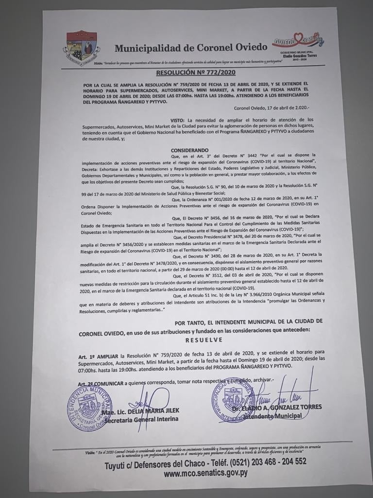 La municipalidad de Coronel Oviedo a través de la resolución 759/2020 amplia el  horario de atención para los supermercados , autoservices y minimarket de 07:00 hs a 19: 00hs hasta el domingo 19 de Abril.