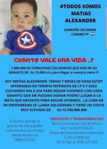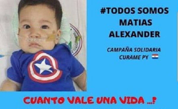 Matías Alexander es otro de los niños que padece la dolencia AME y quien será beneficiario de la medicación. También se encuentra en marcha una campaña nacional en que sus familiares buscan “1.000.000 de corazones solidarios que den su granito de G. 15.000 cada uno para llegar a nuestra meta”.