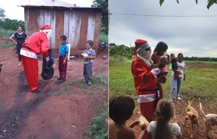 Vestido de Papá Noel, el uniformado llegó a bordo de un motocarro, con bolsos muy cargados, para sorprender a los niños de una zona de la compañía Santa Teresa, en la localidad de Cambyretá, Itapúa, cuyas familias son de muy escasos recursos.