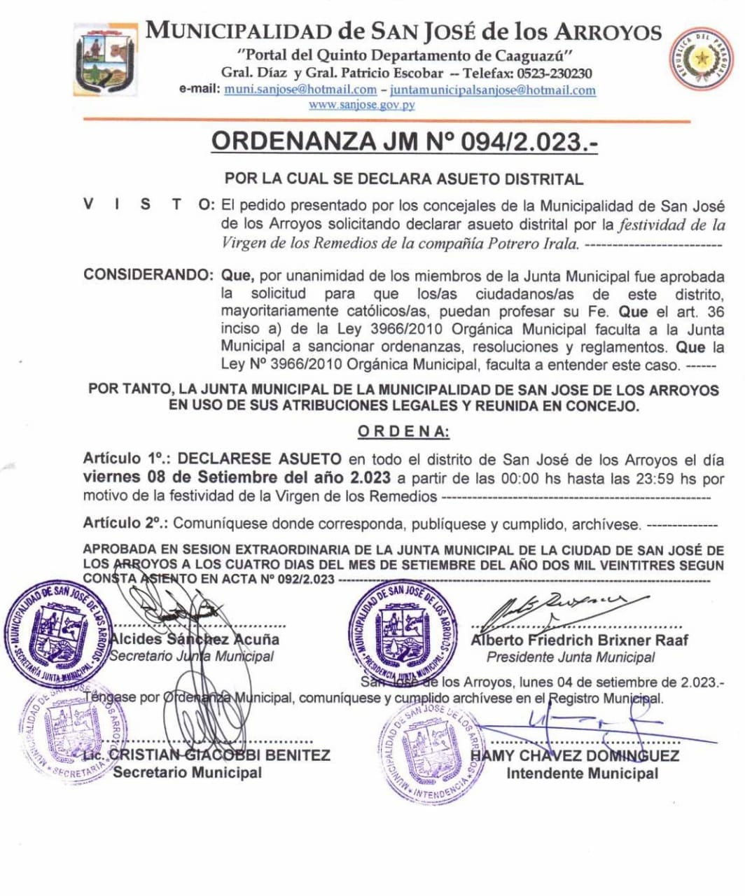 La ordenanza de la corporación legislativa comunal, reunida en sesión ordinaria, los concejales en pleno resolvieron para que en esta fecha del calendario mariano distrital, a los efectos la población sanjosiana puedan participar con normalidad de los actos religiosos a ser celebrado el día viernes 8 de setiembre en su santuario ubicado en la compañía Potrero Irala.