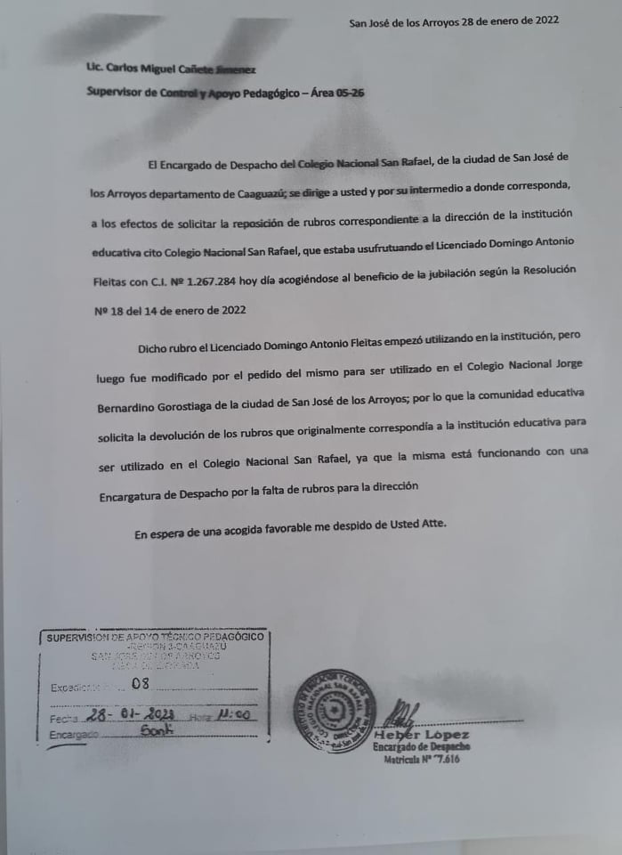 Durante la recepción de la nota entregado al actual supervisor pedagógico; Lic. Carlos Cañete, esté se comprometió a los docentes y padres de los estudiantes, que tal pedido elevaría a la otra instancia, La Dirección Departamental de Educación a cargo de la Lic. Alcira Benítez, a los efectos de zanjar el problema.