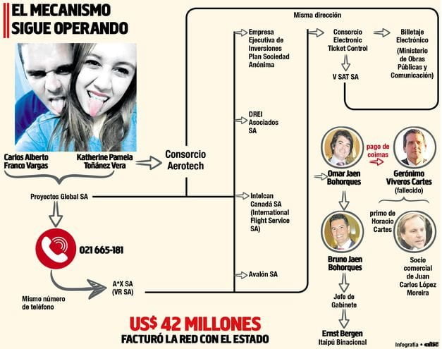 La misma dirección Pero la coincidencia no está solo en un número telefónico. Proyectos Global formó parte del Consorcio Aerotech, que en 2019 recibió un contrato de casi G. 2.000 millones también con la Dinac.